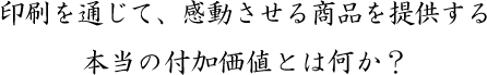 弊社は『印刷を通じて、ユーザー様を感動させる商品を提供する』を企業理念とし、客先様の成長とともに、社会が潤い、弊社も成長させて頂く意味合いで事業を推進してまいりましたが、近年は、社会の価値観、物の移り変わりが早く、『本当の付加価値とは何か?』を新たなテーマとして付け加え、持続的な成長を実現するため、『付加価値の極み』を追求した商品作りを展開してまいります。